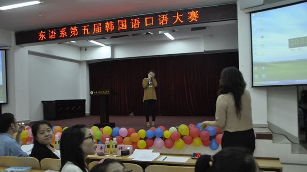 2014年12月14号,在学院领导及系领导的大力支持和关心指导下,在东语系老师的极力倡导和积极准备下,为了提高我系韩语专业学生的口语表达能力和应变能力,加强同学们学习韩国语的兴趣和热情,促进同学们间的交流,丰富大学生活业余生活,特举办“东语系第五届韩国语口语大赛”,并获得了圆满成功。