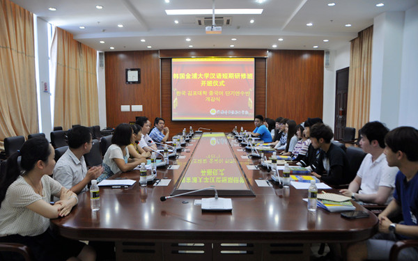 6月26日下午,我院第四届韩国金浦大学汉语短期研修班在综合楼7楼第一会议室开班,学院杨学前副院长,对外合作交流处、教务处、东语系等部门负责人、研修班授课教师代表以及来自韩国金浦大学的11名学生参加了开班仪式。