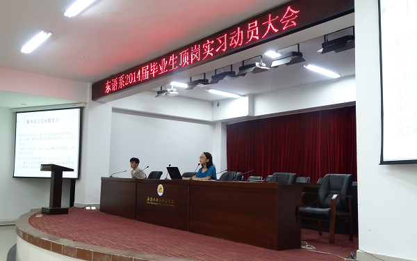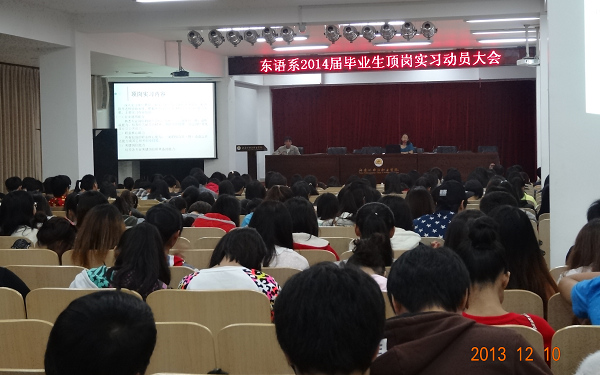 2013年12月10日晚8:00于我院多功能报告厅举行了东语系2014届毕业生顶岗实习动员大会,我系张伟书记和许梅花副主任均出席了本次动员大会,会议由团总支吴深书记主持。