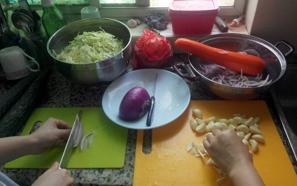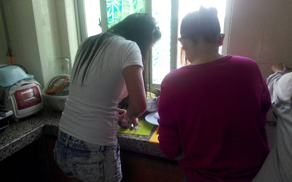 同学们在熟络了老师家后,就各尽其职了:有的在厨房向许老师学做炸酱面,有的则在客厅与金老师交谈.玩游戏,当然也少不了一些因为好奇一个中韩家庭的家居生活格调而仍在参观的同学。在厨房中忙碌的许老师一面忙着准备做炸酱面的材料,一面与在一旁帮助的学生交谈,从洗菜到切菜,再到炒菜,每个环节都有条不紊地进行着。而在客厅的同学们则在和外教说说笑笑,虽然处于韩语初级阶段的我们所掌握的的词汇量不够多,与外教正常交谈起来还很困难,但是那种心意会神的交流却来得更为自然,和同学们玩游戏的外教显得格外可爱,完全和同学们打成一团,那种源于心中的欢乐溢于言表。