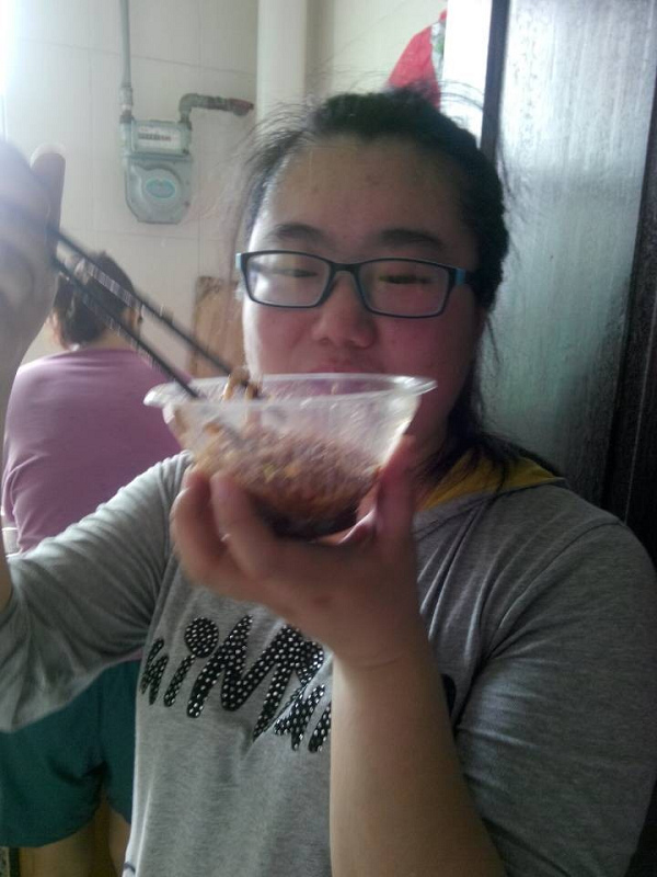 时间在同学们的欢声笑语中悄悄溜过,一碗碗色香味俱全的炸酱面在许老师纯熟的厨艺以及同学们的共同帮组下从厨房鱼贯而出,同学们就犹如"猛虎下山",径直往厨房门口冲去,看着厨房里拌着的美味炸酱面,闻着诱人的香味,口水便垂涎欲滴,一直向厨房里盛面的同学喊道:"快给我一碗"。第一个拿到面的同学就"受欢迎"了,因为其他同学急于想品尝到面而急奔向他。就在同学们品尝着美味时,外教又从冰箱中拿出了原先腌制好的韩国泡菜,这让原本情绪激动的同学们再次雀跃,一个个就如同打了鸡血样兴奋。沉浸在美味中的同学们还不忘自恋一番,吃着的同时还不忘拿着手机拍照,把那一碗碗色香味俱全的炸酱面以及个人吃相一个不落的记载在手机相册中。很快一大盆炸酱面就被"洗劫一空"了,同学们顶着圆鼓鼓的肚子在收拾碗筷的同时还不忘向老师道谢。
