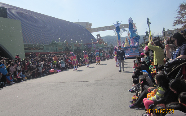 欢欣鼓舞的花车游行已经开始,韩国游客都早早地蹲坐在路两旁等待观看。