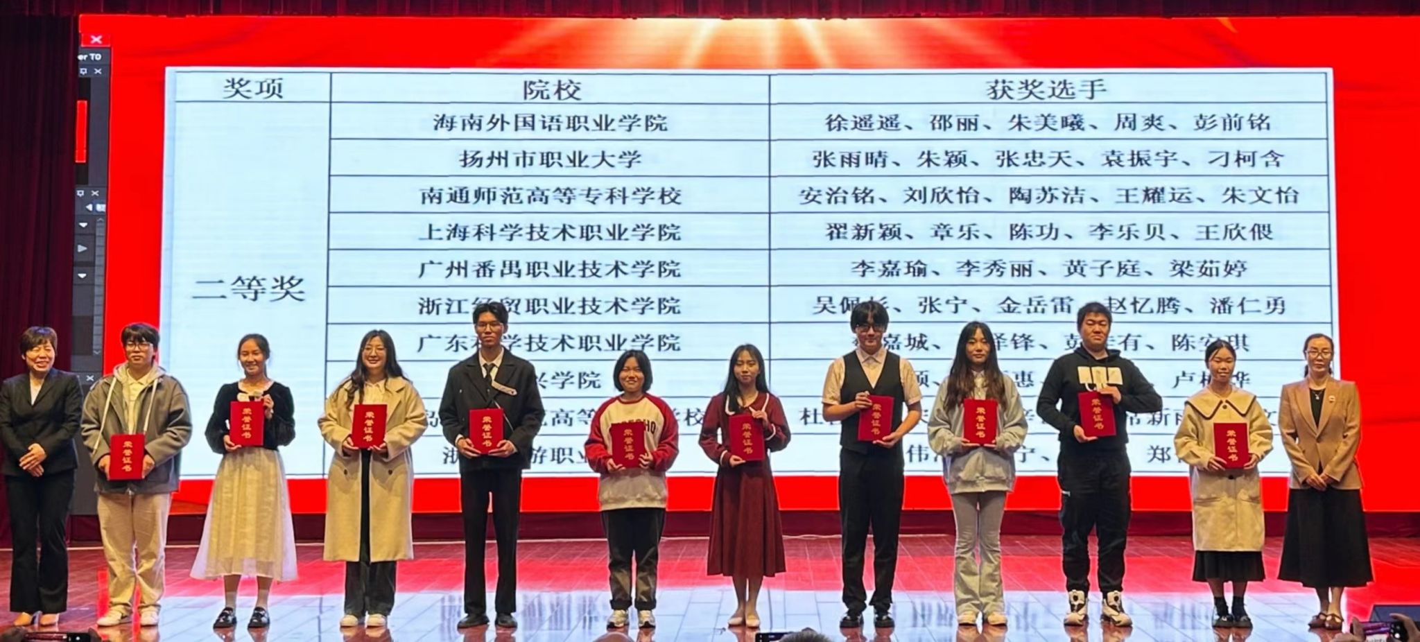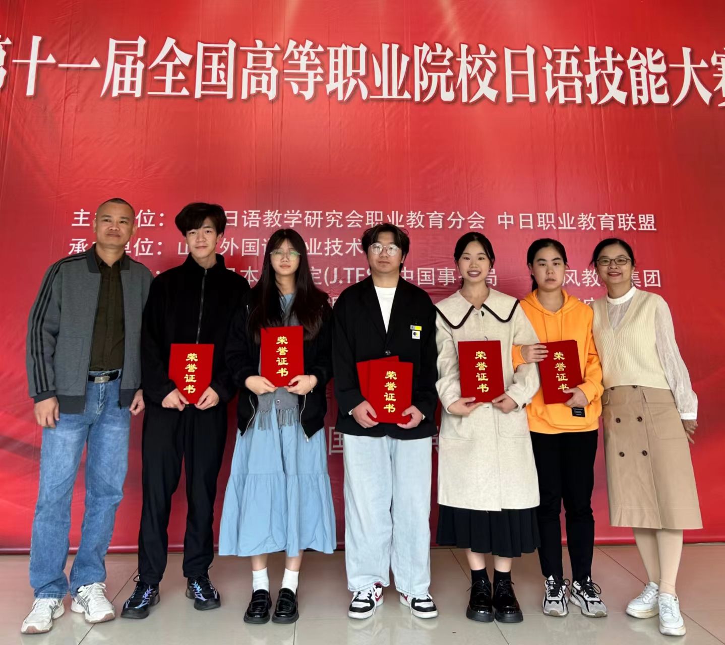 2023年10月22日,第十一届全国高等职业院校日语技能大赛在山东外国语职业技术大学圆满落下帷幕。经过与国内其他30多所高职院校的激烈角逐,我院21级日语专业学生周爽、徐瑶瑶、邵丽、彭前铭、朱美曦五位同学荣获团体赛二等奖,邵丽和周爽分别获得个人赛三等奖。