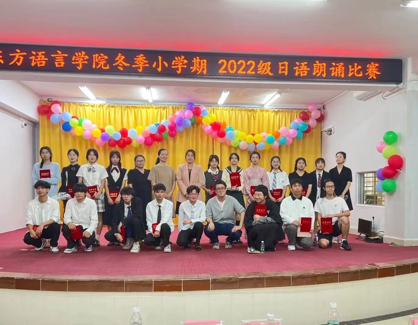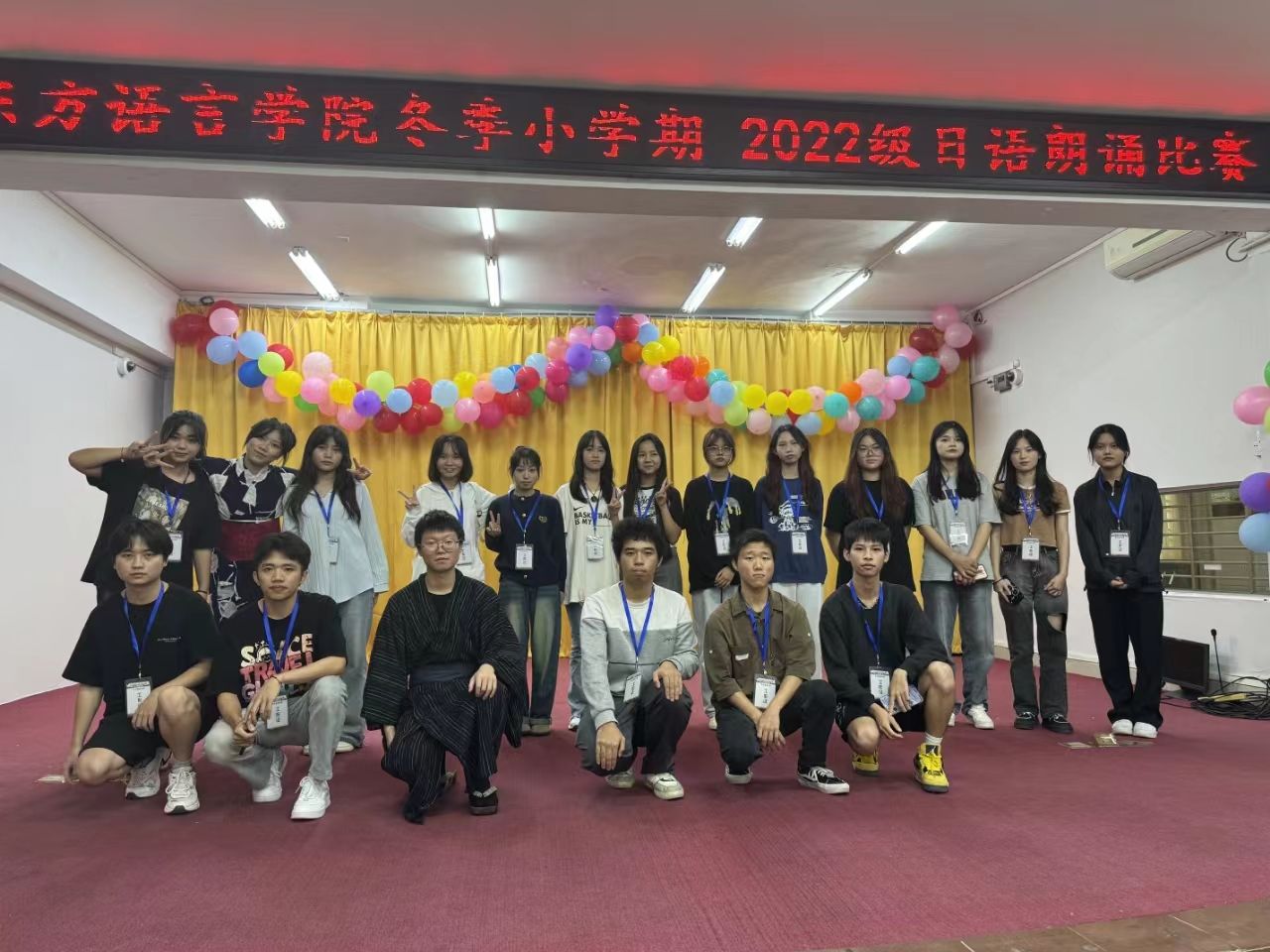 为了丰富校园文化生活,通过日语朗诵的形式,提高同学们的口语水平,激发学生们对日语的学习热情,进一步营造良好的学习氛围,东方语言学院于11月13日上午 9:00-11:30在多功能报告厅举行日语朗诵比赛。参赛者为2022级日语生,幕后工作人员分别来自2022级、2023级日语班志愿者。