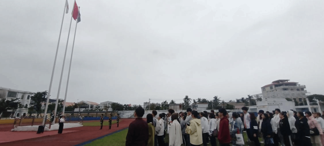 2025年3月17日清晨,海南外国语职业学院东方语言学院全体师生齐聚操场,举行庄严的升旗仪式。在晨光熹微中,雄壮的《义勇军进行曲》缓缓响起,鲜艳的国旗冉冉升起,全体师生肃立行注目礼,表达对祖国的无限热爱与崇高敬意。