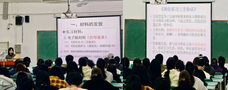 接着,就业指导员王纾宁老师就实习与就业材料的准备和提交进行了具体指导。她详细讲解了实习材料与就业材料的区别、各类材料的填写规范、材料提交时间节点;重点说明了《就业协议书》的签订要点;专门介绍了网签平台的操作流程及注意事项。此外,王老师还重点宣讲了留琼就业、"三支一扶"、基层就业等多元化就业政策,为毕业生拓展了就业视野。