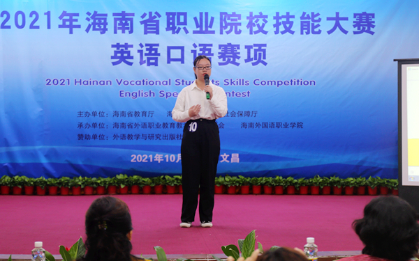 此次比赛由海南省教育厅、海南省人力资源和社会保障厅共同主办,海南省外语职业教育教学指导委员会、我院共同承办,外语教学与研究出版社为赞助单位,集结了省内各高职院校佼佼者同台竞技、角逐较量,代表了我省高职院校学生英语口语最高水平,是高职院校优秀英语教学成果的一次展示。