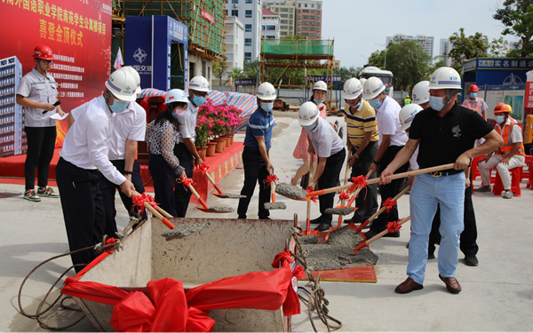 beat365英国官方网站党委办公室、纪检监察处、学生处、后勤处等负责人及相关人员,海南发展控股置业集团有限公司副总经理张东红、区域项目党支部书记、区域副总监相关负责人,海南新世纪建设科技有限公司总监史丽娟,中交一公局集团有限公司海南片区总经理张显楼,中交(三沙)开发建设有限公司总经理朱祖岭、总工程师相关负责人及各参建单位的相关人员参加封顶仪式。