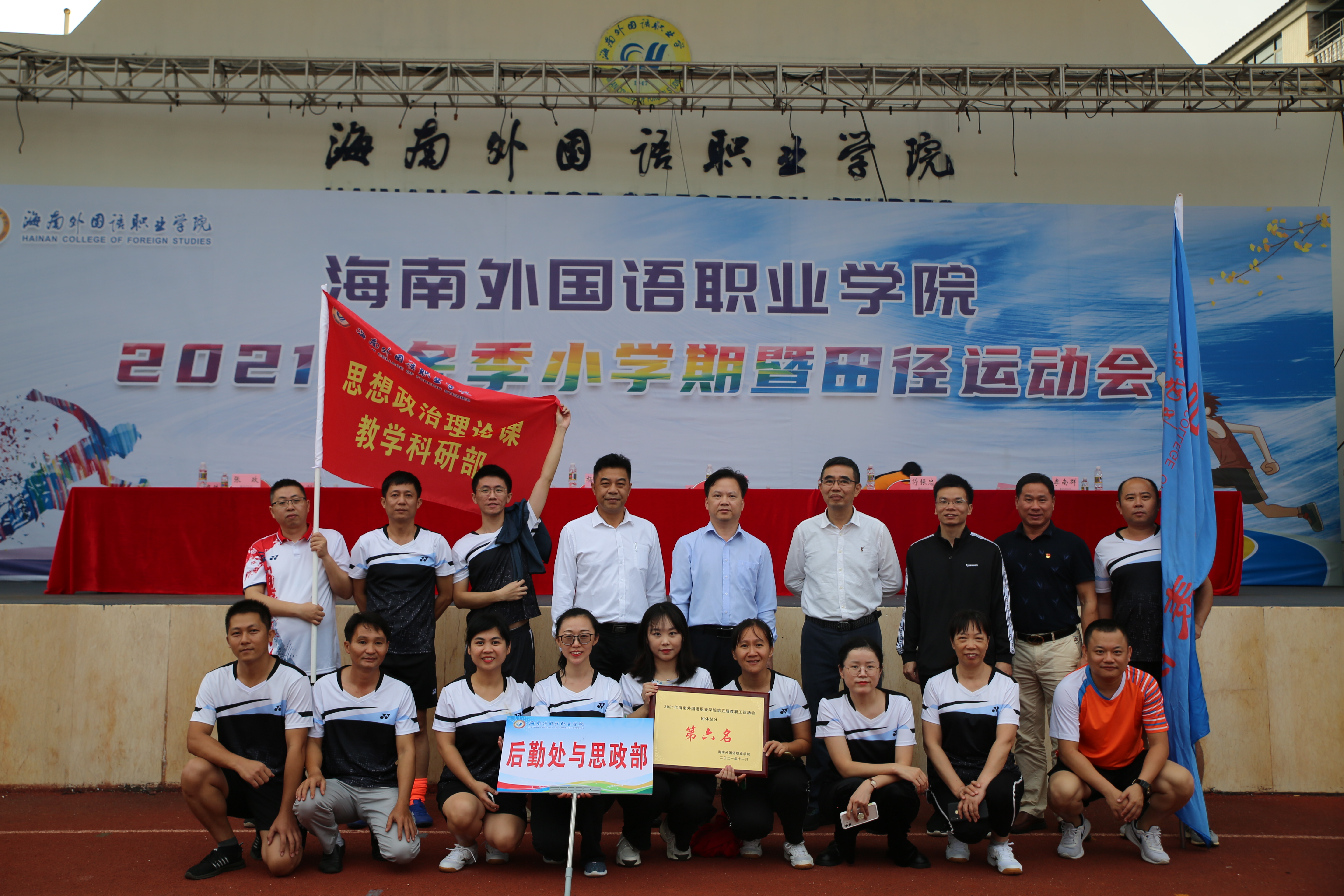 我院第五届职工运动会于2021年11月15-16日在运动场举行,后勤处与思政部代表队参加,通过入场式、踢毽子、跳绳、颠球和8*30米接力五个项目的角逐,后勤处与思政部代表队获得接力比赛项目的第一名,团体总分荣获第六名。