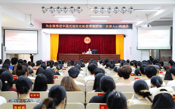 6月2日,学校党委书记佴建乔为英语学院250名学生讲授思政课,围绕“中国式现代化理论的重大创新”、“新时代中国式现代化建设成就”、“奋楫扬帆海南自贸港”“为中国式现代化注入职教力量”“新时代新征程青年大学生的责任与担当”等方面内容,聚焦中国式现代化的中国特色、本质要求和重大原则,带领学生重点学习中国式现代化的核心要义,解读在全岛封关运作下海南自由贸易港的政策、制度体系,并介绍了基于此背景下beat365全面突出“外语+”特色,在产教融合、构建校企紧密合作协同育人等方面取得的成绩,阐述了学校站在更高起点新征程上如何奋力写好中国式现代化职教篇章的高质量发展之路。佴建乔号召同学们,要做信念坚定、铭记初心的理想者,勇挑重担、勇当先锋的担当者,坚韧不拔、意志顽强的吃苦者和勤勉向上、乐于奉献的奋斗者,让青春在全面建设社会主义现代化国家的火热实践中绽放绚丽之花。