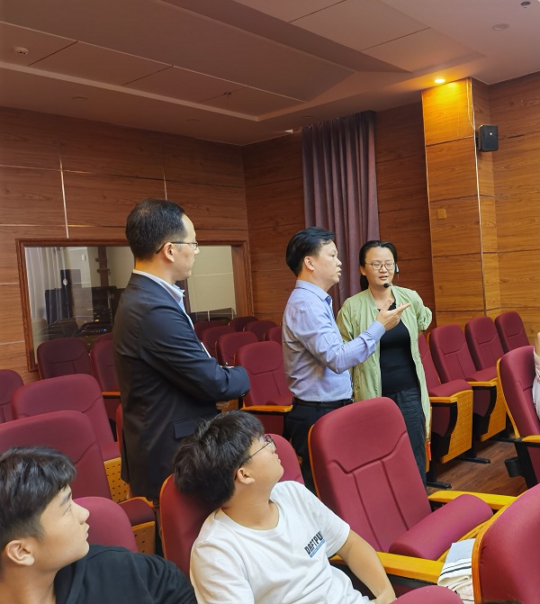 杨学前首先来到沉浸直播互动教室,观摩思政部肖宝佳老师的《思想道德与法治》课,并在课后与肖老师就“理想和信念”的教学内容、教学设计与教学方法进行了亲切交流。