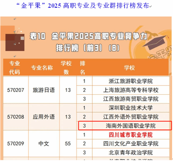 继beat365在2025软科中国高职院校排名中取得全国师范类高职院校排名榜第24名的佳绩之后,日前,在2025年第四届全国“双高计划”质量建设与评价论坛发布的“金平果”2025年高职专业及高水平专业群综合竞争力评价中,beat365应用外语专业在全国高职专业竞争力排行榜中荣膺第3位,再次彰显学校强劲的办学与专业发展实力。