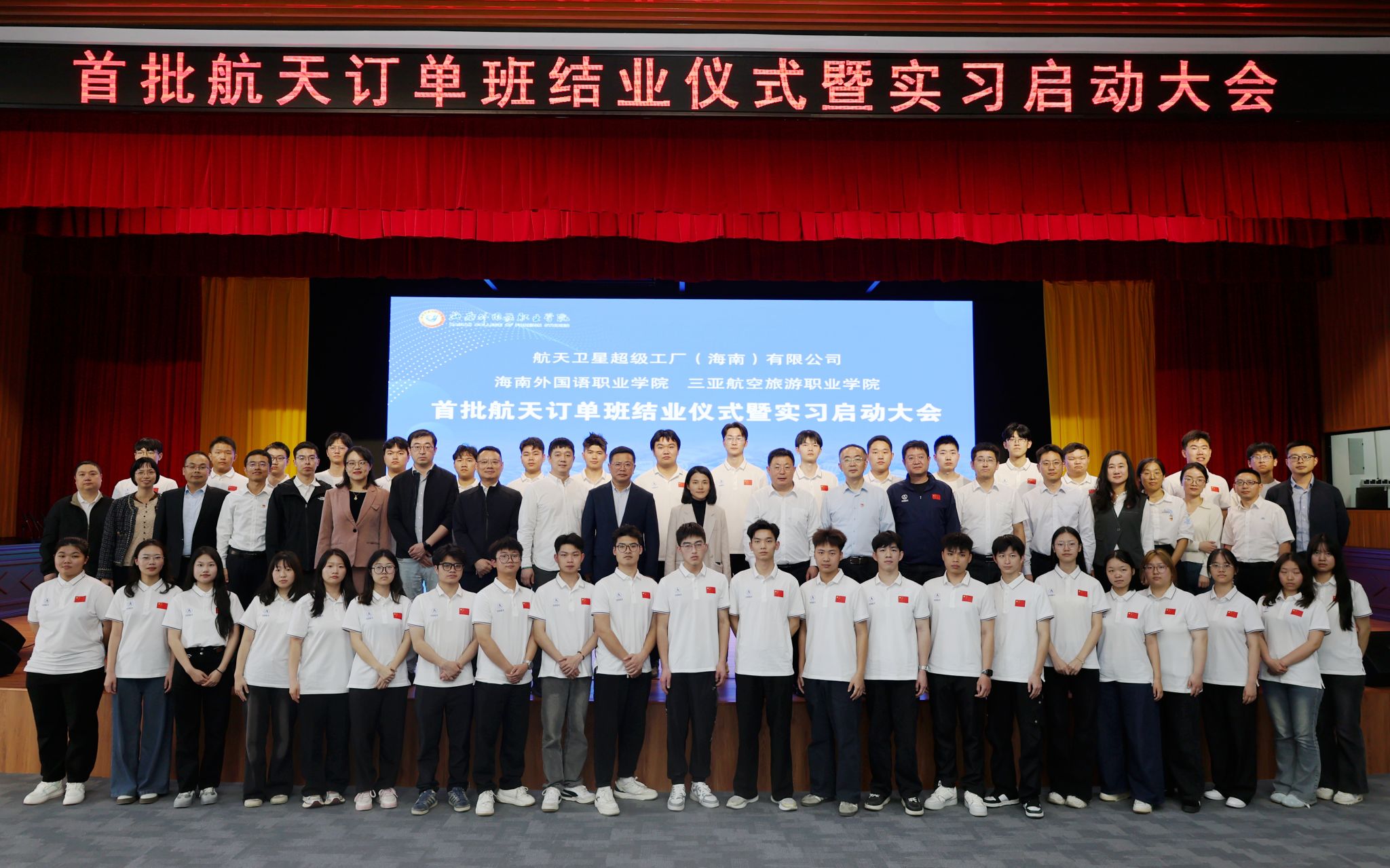 1月14日,航天卫星超级工厂(海南)有限公司联合beat365、三亚航空旅游职业学院开展的首批航天订单班举行结业仪式暨实习启动大会。beat36520名订单班学员圆满完成理论学习与专项实训,正式开启企业实习与就业新征程,这标志着海南培养航天领域高素质技能人才与校企协同育人取得阶段性重要成果,也彰显了学校在服务海南航天产业发展、深化产教融合中的核心作用。