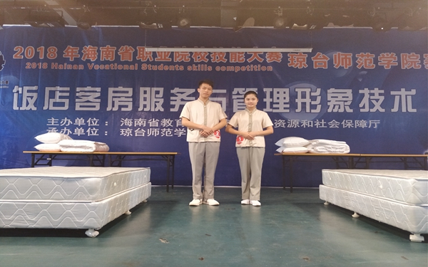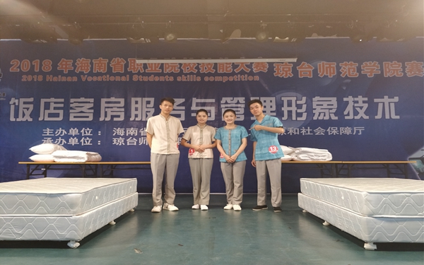 3月24日-25日,2018年海南省职业院校技能大赛(高职组)“饭店客房服务与管理形象技术”赛项在琼台师范学院赛区举行。我院旅游系吴多裕、柯彩云、何小兵、林小桂4名同学组成2个参赛团队,于来自全省高职院校的18个参赛团队的36名选手进行了精彩角逐,选手们不惧挑战敢攀登,分别获得了二等奖和三等奖的好成绩。