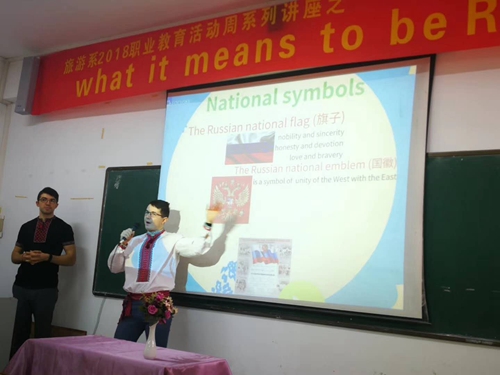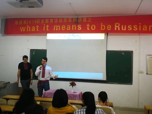 5月11日上午,我系在多12教室举办学生活动系列:外教讲座“what it means to be Russian (认识真正的俄罗斯)”。学生和教师们济济一堂,兴趣盎然,外教Taras 和Alex身着俄罗斯传统服饰,带上俄罗斯的各种糖果,展示着各种精美的图片,侃侃而谈。