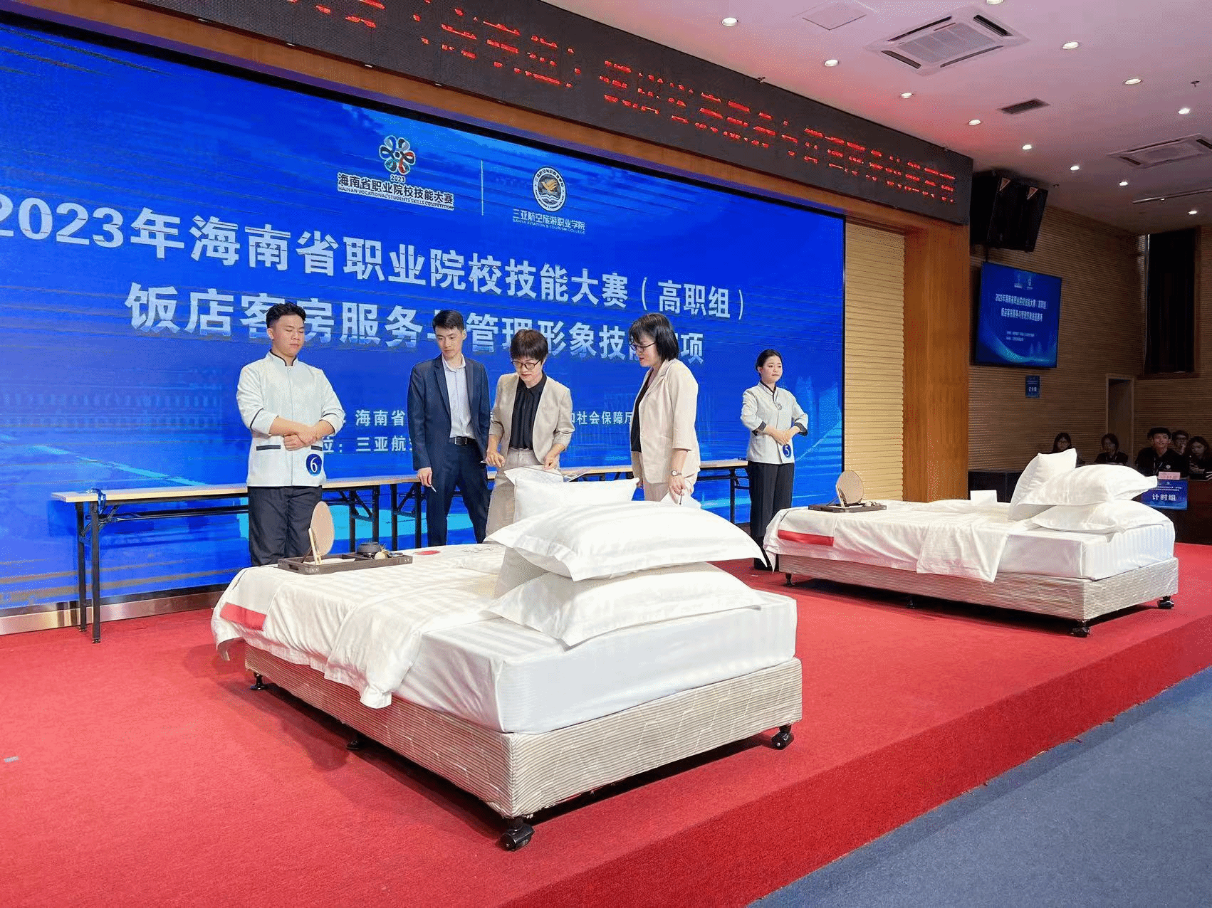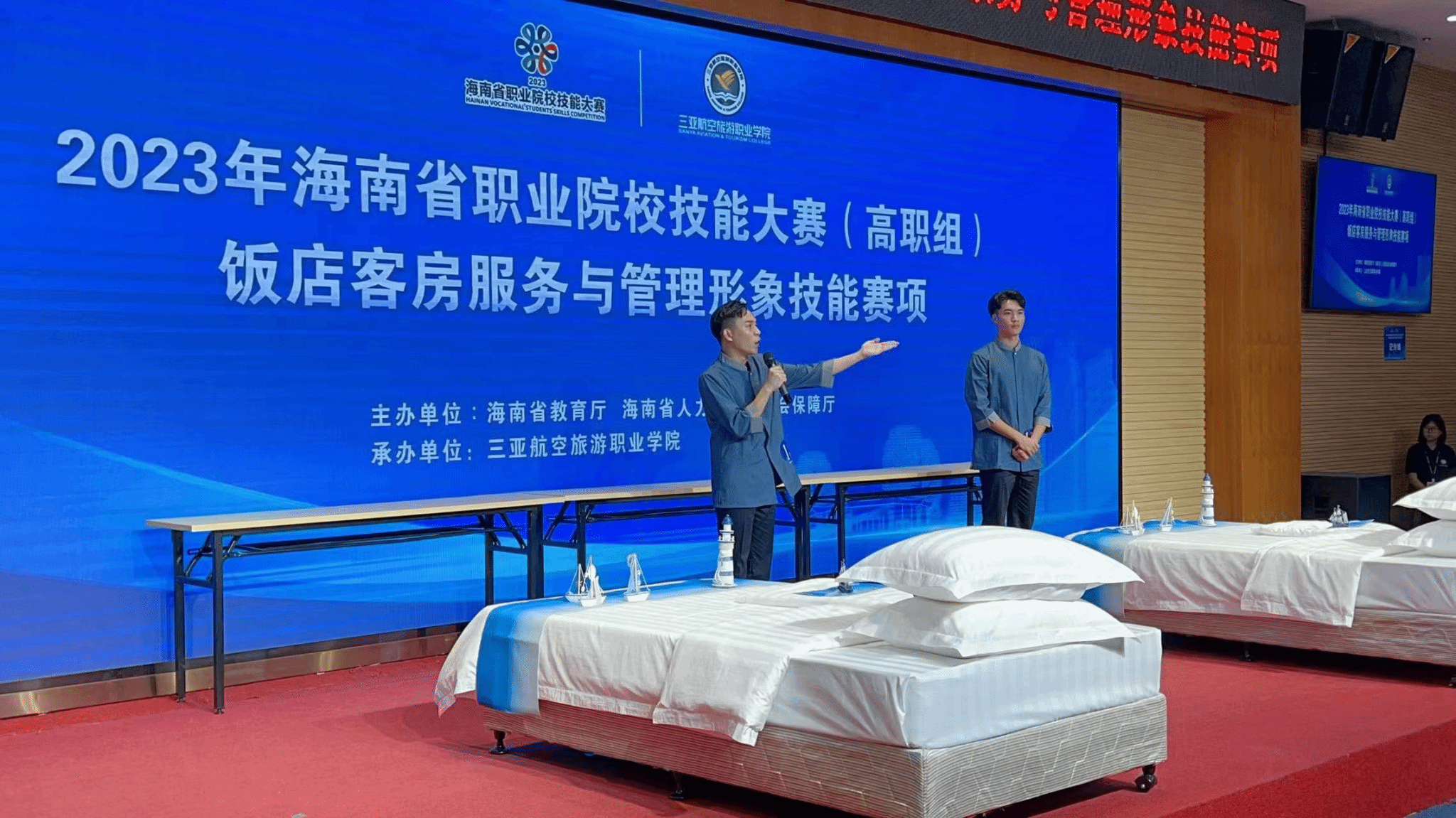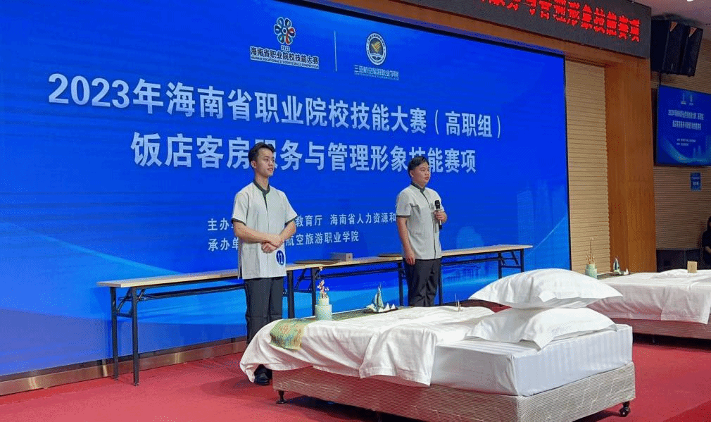 2023年海南省职业院校技能服务大赛(高职组)饭店客房服务与管理形象技能赛项于10月24日-25日在三亚航空旅游职业学院举办,beat365国际旅游学院派出三支学生代表队参加比赛,分别获得全省第二名(邢益栋、陈玉信),第四名(韩明衍、谢盛朝)和第七名(王盛伟、李业辉)的佳绩。