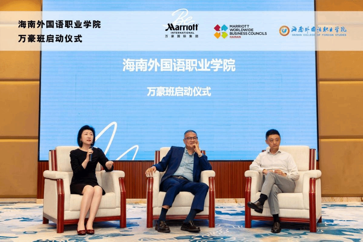 揭牌仪式后,万豪国际酒店集团海南区三家酒店总经理代表:亚龙湾万豪酒店总经理高锦洪、海口万豪酒店总经理张世戎和海口丽思卡尔顿及万丽酒店总经理余淼为学生们做了精彩的职业发展分享。三位总经理从餐厅服务员、会计和前台服务员等一线岗位开始自己的职业生涯,经过数十年的坚守与付出,都成长为优秀的酒店职业经理人。他们表示,酒店是一个锻炼个人综合能力的良好平台,勉励学生们刻苦学习相关知识,积极在实习和工作中提升自己,踏实走好职业发展的每一个过程,每名同学都会在酒店找到属于自己的精彩未来。