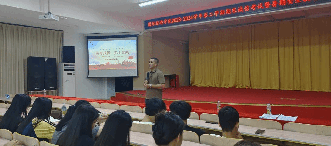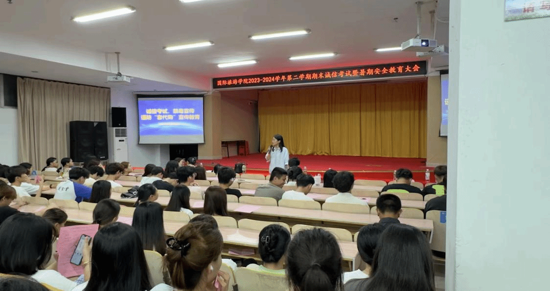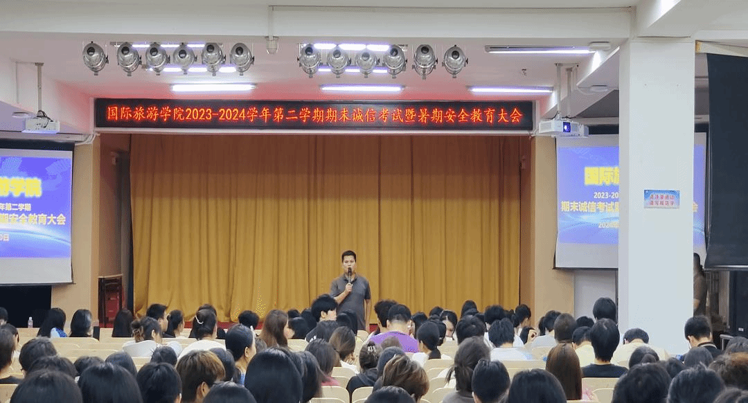 为进一步严肃考试纪律、做好假期安全教育,国际旅游学院于2024年6月30日晚上在多功能报告厅召开2023-2024学年第二学期期末诚信考试暨暑期安全教育大会。会议由学生科科长陈奕埔主持,党总支副书记周群林和辅导员、班主任代表出席会议。