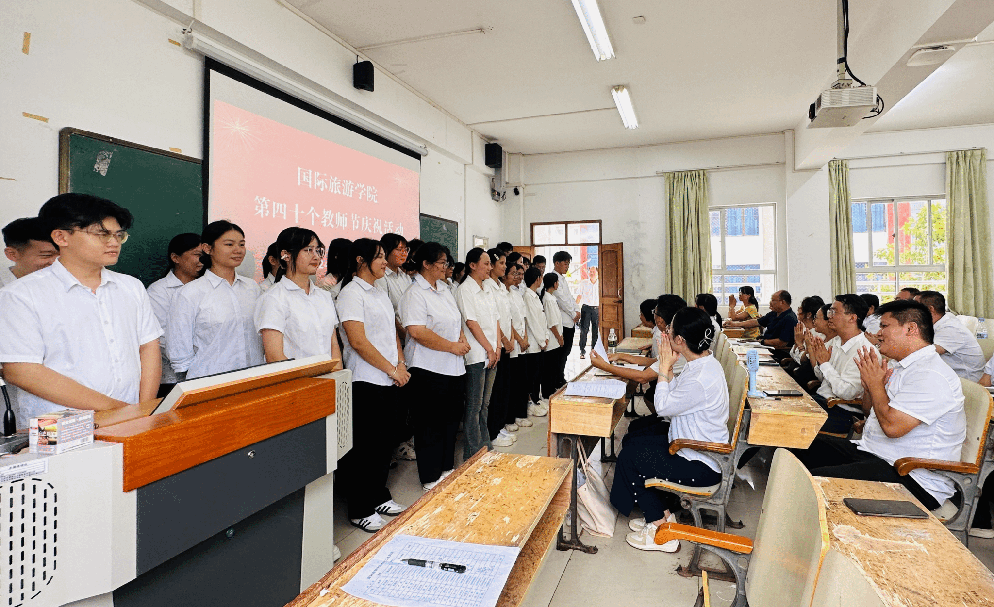 2024年9月10日上午,国际旅游学院召开会议,庆祝第四十个教师节的到来,全体教师、学生代表出席会议,党总支书记林明霞主持会议。