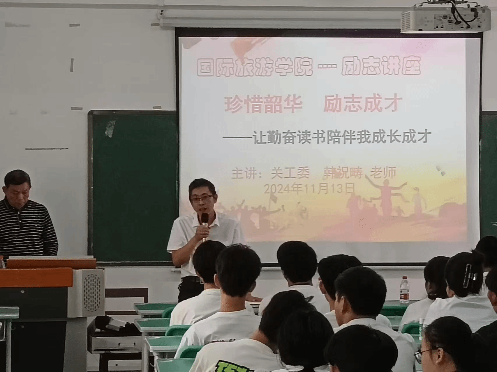 青春如火,梦想闪耀;拼搏奋进,铸就辉煌。为激发学生的内在潜能,点燃他们的学习热情,并坚定他们的奋斗意志,2024年11月13日上午,国际旅游学院在多媒体12教室隆重举办了一场以“让勤奋读书陪伴我成长成才”为主题的励志讲座。此次讲座特邀学校关工委主任韩祝畴主讲,面向国际旅游学院中职二年级的全体学生,为他们带来了一场心灵与智慧的双重盛宴。