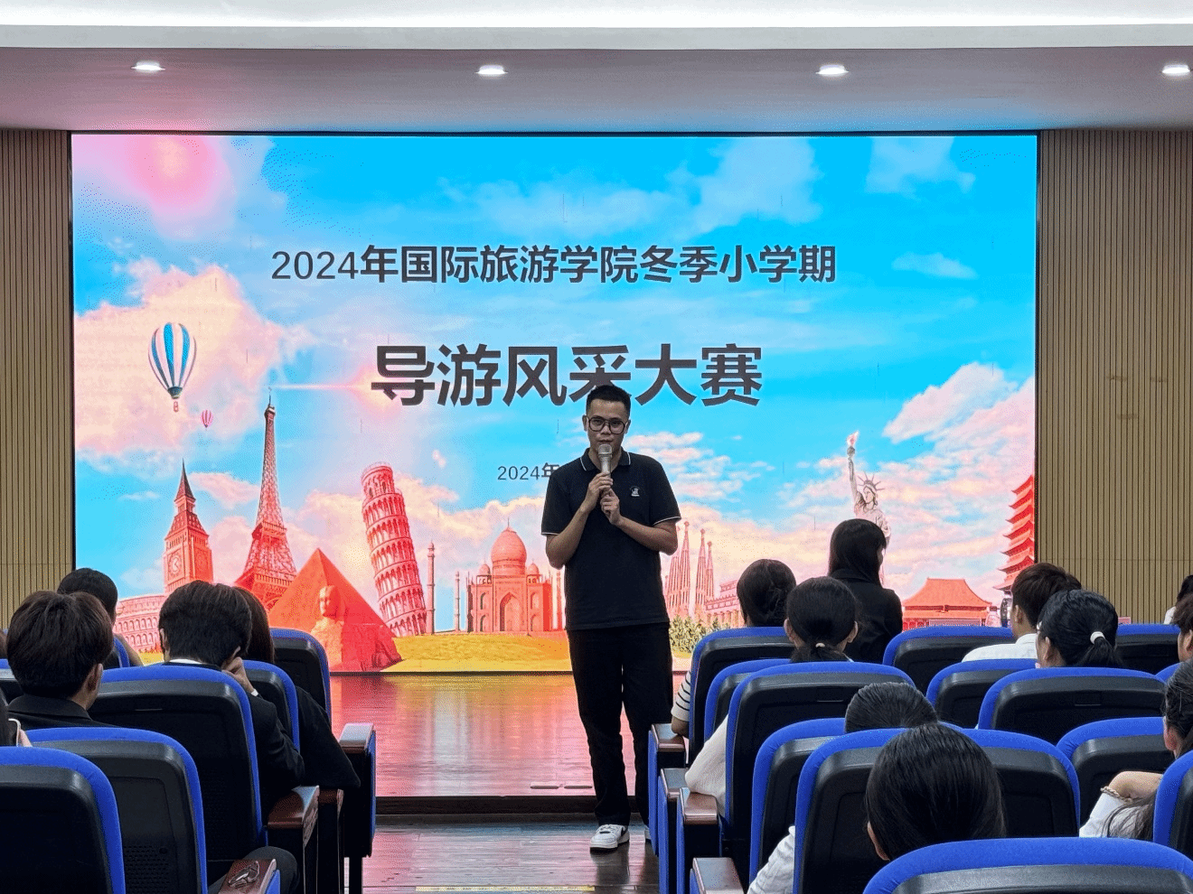 本次大赛面向全院新老生开放,吸引了众多学生的热情参与,尤其是24级新生展现出了极高的积极性和参与度,成为了赛场上的主力军。比赛内容包括个人风采展示和自选导游词讲解两大环节,全面考验了选手们的综合素质和专业技能。