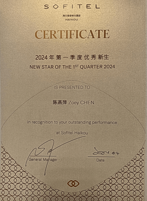 陈燕萍的专业表现和对客户服务的热忱赢得了客人的高度评价,她多次获得客人的点名表扬,这不仅是对她个人努力的认可,也是对她职业素养的肯定。她的出色表现使她荣获了索菲特酒店第一季度优秀新生荣誉称号,这是对她在实习期间卓越贡献的最好证明。