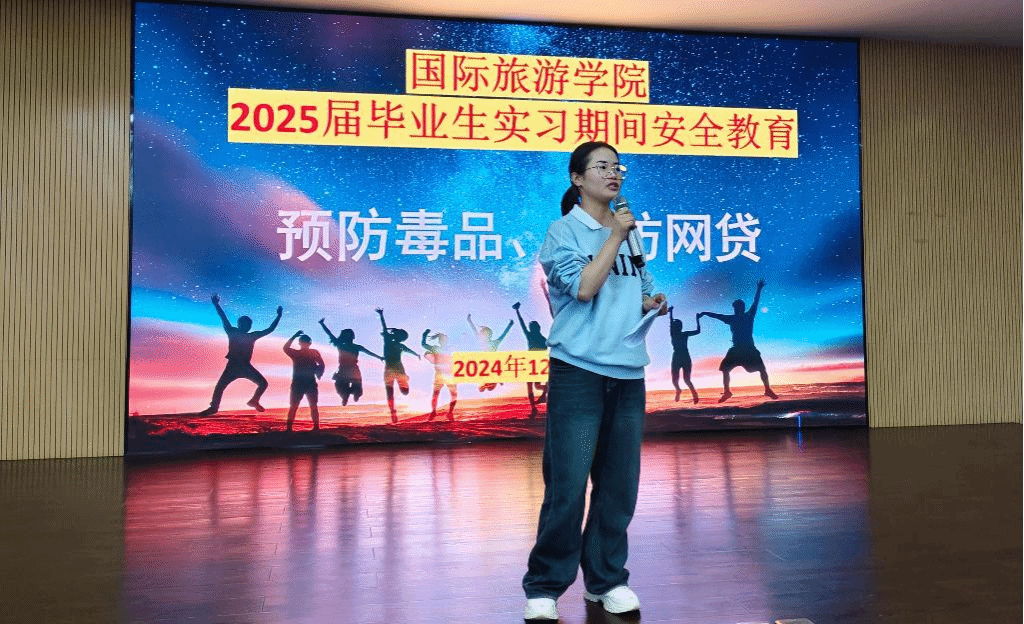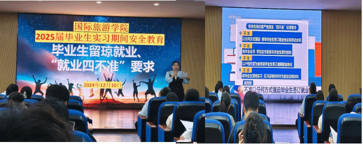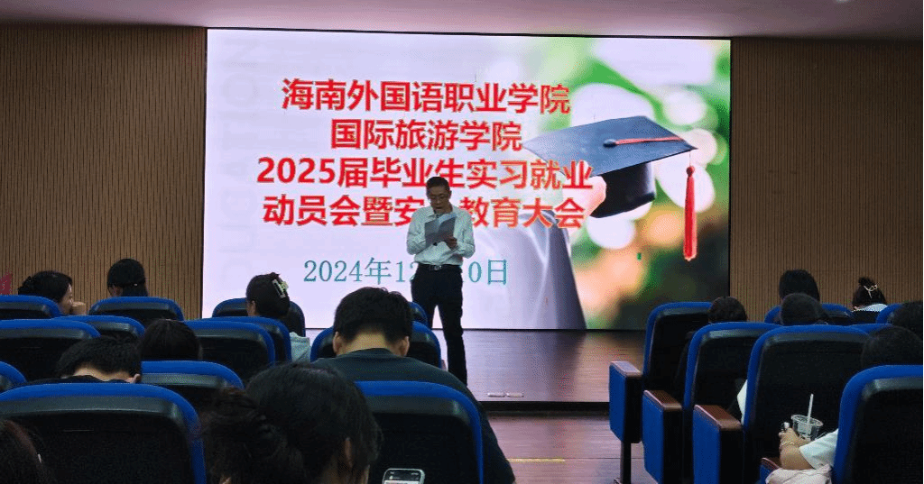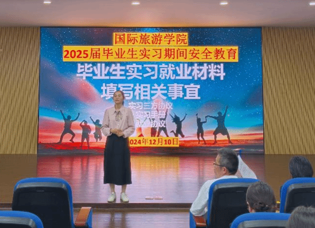 2024年12月10日,国际旅游学院2025届毕业生实习就业动员会暨实习安全教育大会在beat365图书馆VR导游实训室召开,国际旅游学院谢孟副院长、周群林副书记、教研室主任、实习就业指导老师和2025届12月参加岗位实习的毕业生参会。