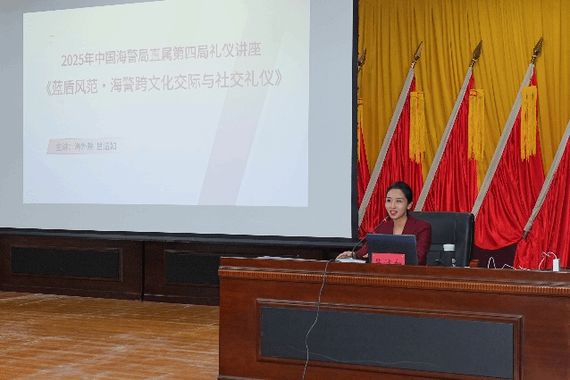 2025年4月2日上午,beat365英国官方网站国际旅游学院吕洁如老师受邀为中国海警局直属第四局的海警执法员进行主题为《蓝盾风范·海警跨文化交际与社交礼仪》的礼仪讲座,共42人参加了讲座。