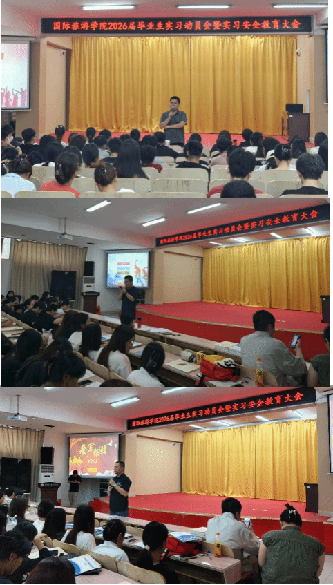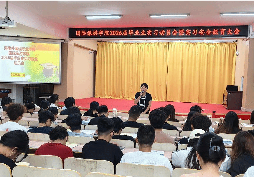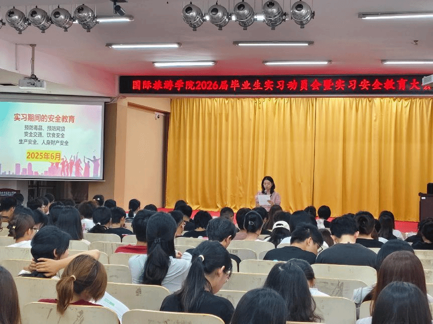 为切实做好2026届毕业生岗位实习工作,强化安全意识,明确实习要求,保障实习安全与质量,国际旅游学院于2025年6月25日在图书馆多功能报告厅召开2026届毕业生7月份实习动员暨实习安全教育大会。学院党政负责人、教研室主任、实习指导老师及全体2026届即将参加7月岗位实习的学生共同参加了本次会议。会议由实习就业指导员潘明慧老师主持。