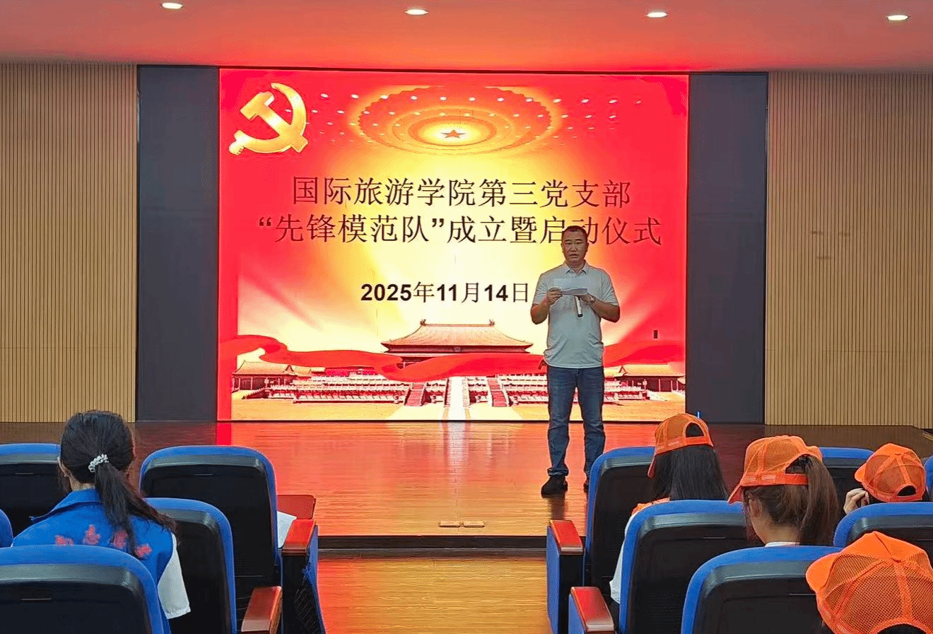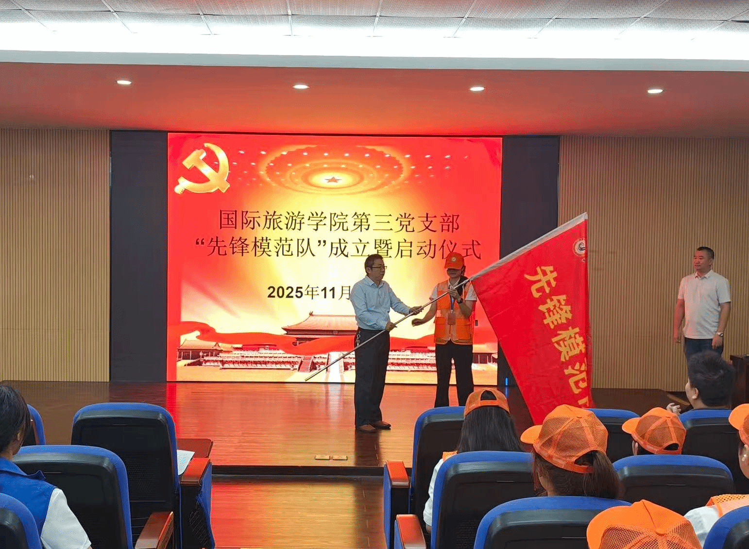 随后,周群林郑重宣布:“国际旅游学院先锋模范队,正式成立,启动!”铿锵有力的话语回荡在整个会场,标志着国际旅游学院学生自我管理与服务实践迈上了一个新的台阶,开启了以党建带团建、以党员带群众的育人新篇章。