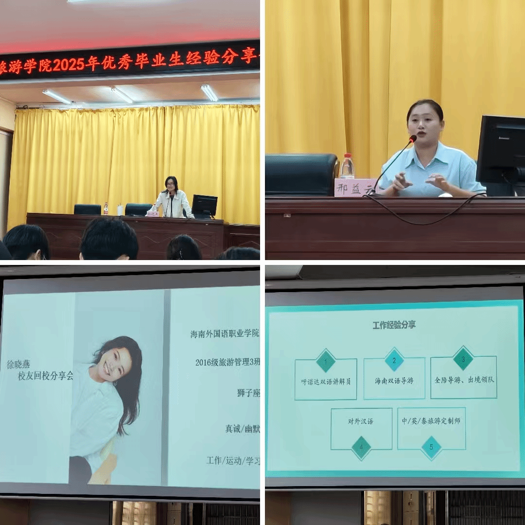 分享会上,现任海南百事通国际旅行社多语种旅游定制师的邢益云,以 “敢尝试”为核心关键词展开分享。她回顾了在校期间从呀诺达景区中文讲解员起步,凭借勇气报名海南省导游大赛,斩获市级二等奖、省级三等奖的经历。这次尝试让她发掘了英语专业潜力,逐步成长为双语讲解员,积累了丰富的涉外服务经验。毕业后,她深耕一线,遍历中文导游、英文导游、出境领队等多个岗位,接待过 10多个国家的游客。疫情期间,她虽尝试过自媒体、花艺等领域,但始终坚守对旅游的热爱,转型旅游定制师后自学泰语,专注海外定制业务。她寄语学弟学妹,要勇于把握机会、正视迷茫、坚守热爱,在试错中明确方向。