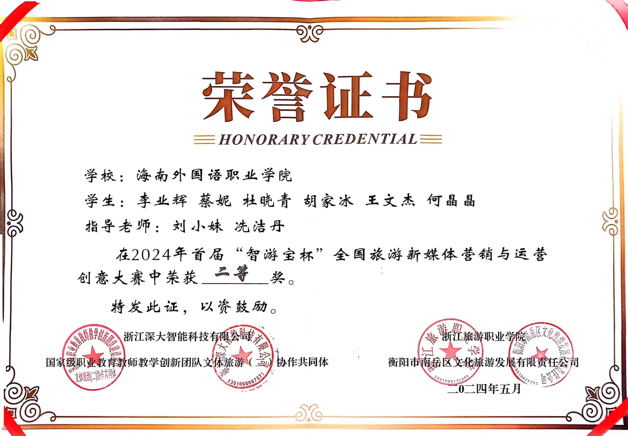 5月19日,2024年首届“智游宝杯”全国旅游新媒体营销与运营创意大赛中成功落幕,我院“六小玲珑”(选手:李业辉、王文杰、胡家冰、杜晓青、何晶晶、蔡妮)和“光影之队”(选手:唐思强、程倩云、赵东乙、许政霞、杨妍、许泽诗)两支队伍凭借出色的营销策略和创新思维,赢得了评委的一致好评,取得了二等奖和优秀奖的优异成绩。这不仅是对学生们能力的肯定,也是我院教育教学质量的显著体现。