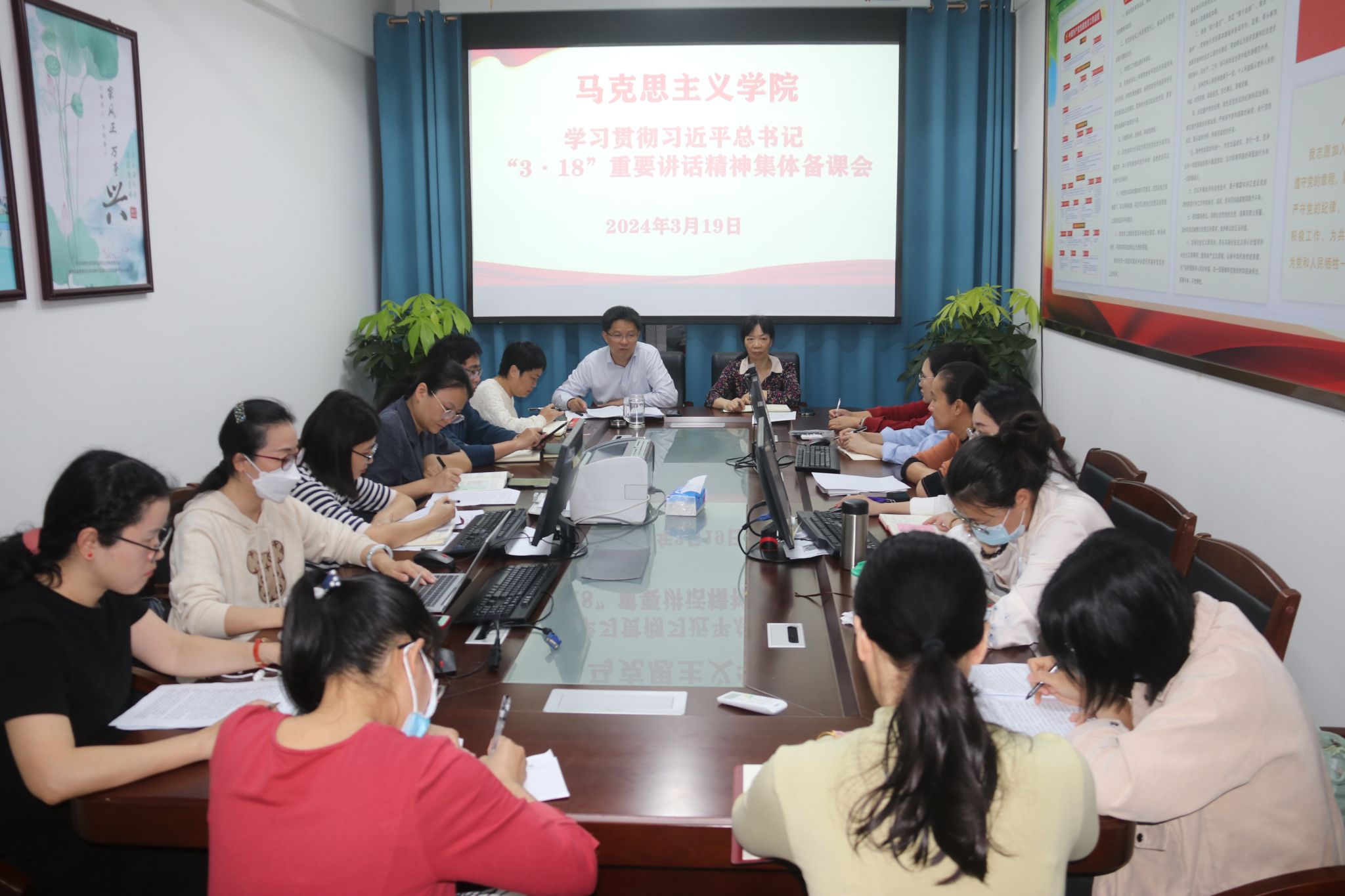 为落实立德树人根本任务,切实上好思政课这门关键课程,马克思主义学院3月19日召开学习贯彻习近平总书记“3·18”重要讲话精神集体备课会,本次备课会由党总支书记邢益承主持,周清云院长和马院全体教师参加。