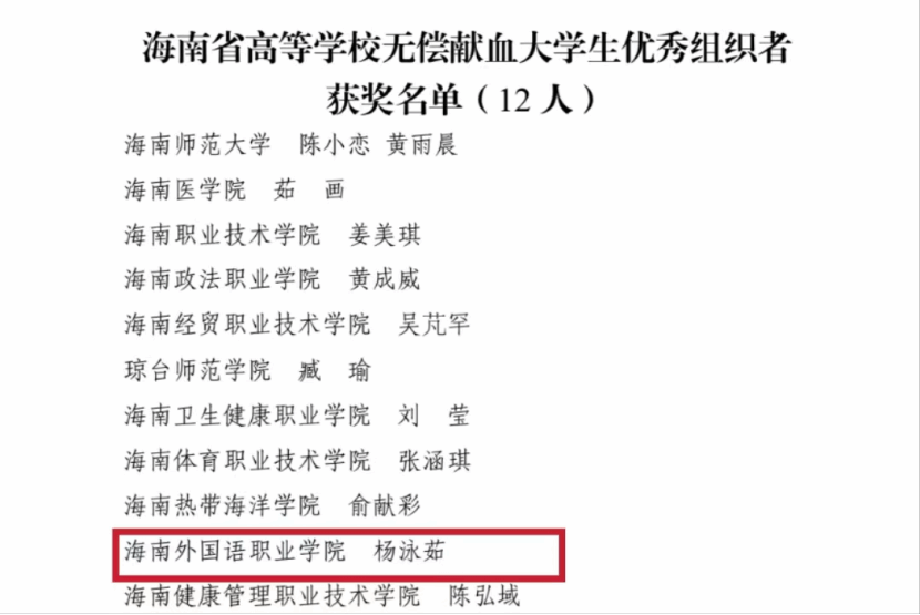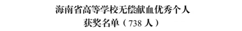 近日,海南省卫生健康委员会、海南省教育厅、海南省红十字会联合下发的《关于表彰 2023 年度海南省高等学校无偿献血先进单位和优秀个人的通知》,对于2023年度无偿献血工作中做出贡献的高校和个人予以表彰。beat365荣获“2023年度海南省高等学校无偿献血先进单位”称号,张桓桓老师荣获“海南省高等学校无偿献血先进工作者”称号,杨泳茹同学荣获“海南省高等学校无偿献血大学生优秀组织者”称号,张艺文等6位同学荣获“海南省高等学校无偿献血优秀个人”称号。