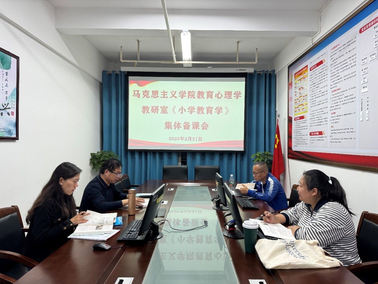 为进一步提升教育学课程教学质量,深化学科理论与实践融合,2025年2月21日,马克思主义学院教育心理学课教研室召开了《小学教育学》课程2025春季学期首次集体备课会。本次集体备课会由教研室主任唐丁方教授主持,教研室《小学教育学》课程全体教师参会,围绕课程体系优化、教学方法创新及学生专业能力培养展开深入研讨。