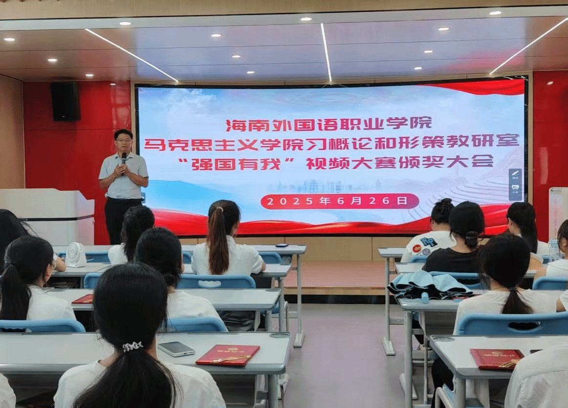 为深入学习贯彻习近平新时代中国特色社会主义思想,激励青年学子勇担时代使命,2025年6月26日,马克思主义学院《习近平新时代中国特色社会主义思想概论》课教研室和《形势与政策》课教研室联合举办的2024-2025学年第二学期实践教学“强国有我”视频大赛颁奖仪式在学院思政实践中心隆重举行。