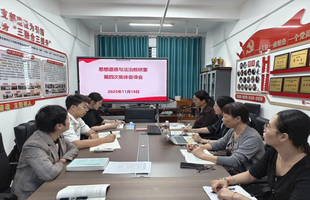 为切实提升思想道德与法治课程教学质量与育人实效,思想道德与法治教研室于 2025年11月日在综合楼 C604 会议室召开本学期第四次集体备课会。本次备课会由教研室主任陈若团主持,肖宝佳、唐灵燕两位老师担任主备人,全体授课教师全程参与研讨交流。