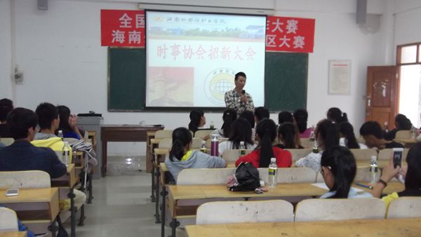 接着,会议进行了时事协会学生新干部竞选活动,分别有五位学生参加了竞选,他们分别作了自我介绍并对说明今后在协会的发展计划,最后推选出林佳娜、李青梦、陈权、吴润青和王海连五人作为学生干部。