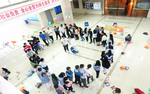 交流会在综合办公楼一楼大厅举行。为了更好地营造会场的气氛,会员们积极布置活动现场,五颜六色的气球和彩带温馨了整个会场。19:00交流会正式开始,同学们围成一个大圈坐在大厅的地板上。首先由主持人致开幕词,再由周群林老师上台发言,老会长黄艳霞介绍会场的纪律以及新会长马文静解释希望通过本次交流会,会员间建立友好关系。
