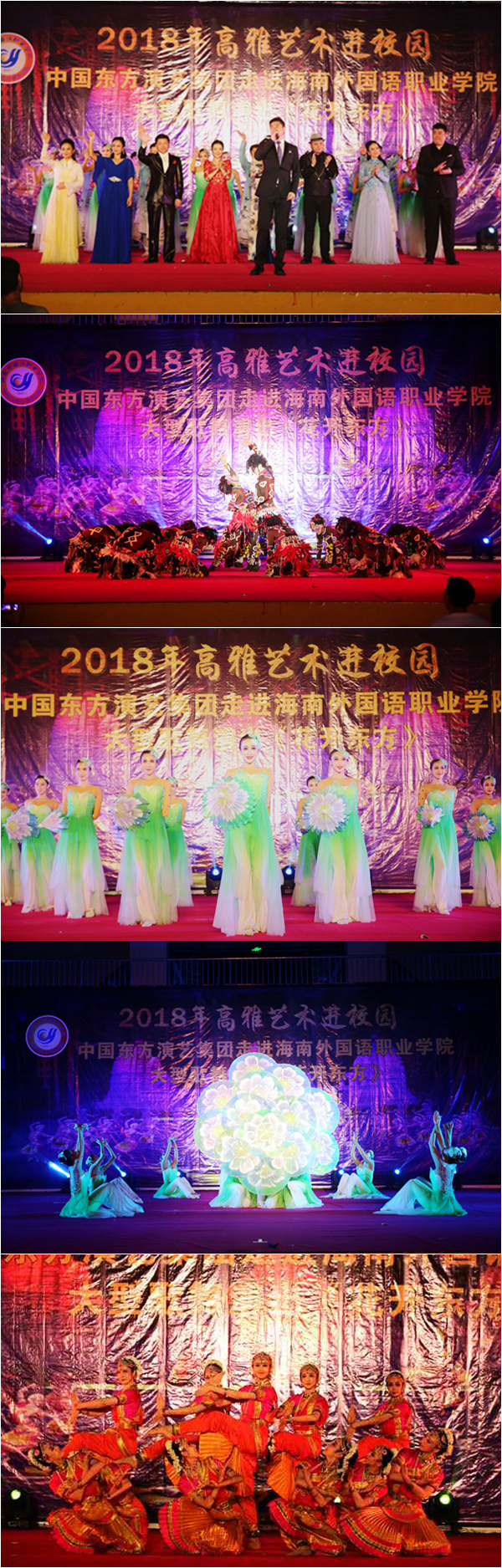 4月28日晚,2018年高雅艺术进校园中国东方演艺集团大型歌舞演出《花开东方》在我院体艺馆精彩开演。学院领导陈礼民书记、徐畅副书记、周运诗副院长,党委委员梁松主任(部长),与千名师生一同观看了演出。