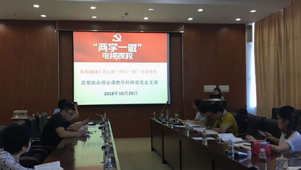 为继续认真贯彻落实学院党委统一部署,思想政治理论课教学科研部党总支部于10月29日下午组织党员在综合楼七楼会议室召开了集中观看2018年“两学一做”电视夜校第五期节目,本次会议由第三党支部书记洪一丹同志主持。