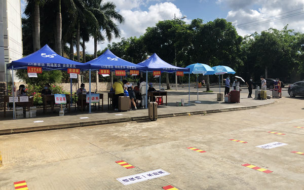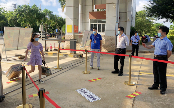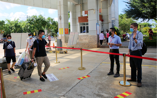 在学院北门,李渝凤院长亲切问候了正在北门迎接学生返校的值班中层干部、各系部老师和学生志愿者们,并与文昌市教育局派驻我院的教育专员、市疾控中心派驻我院的疾控和医务工作人员亲切交流,感谢他们对学院学生返校复学工作的大力支持。