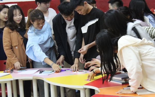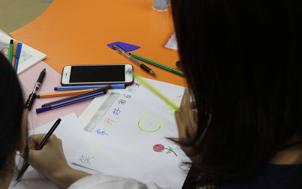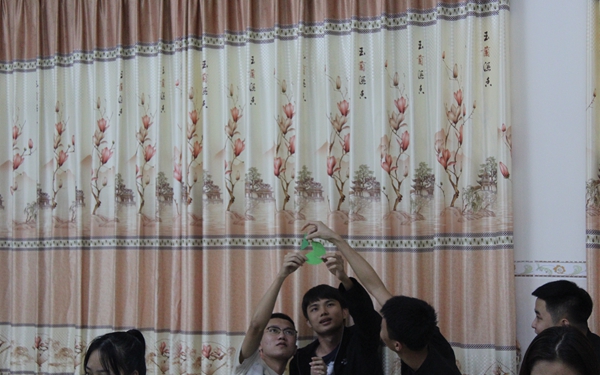紧张而欢快的自我介绍之后,在背景音乐的欢快气氛下,指导老师要求每个参与者到场地中央的盘子里选取一张自己喜欢的纸片。根据自己所选纸片的颜色与形状,到群体中寻找能与自己图形契合的“有缘人”。