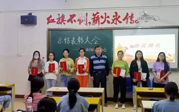 会议议程第三项,关工委韩祝筹主任和思政部概论教研室主任兼读书协会指导教师赵佳钰为获奖会员颁发奖状和奖品。韩祝畴主任希望会员们不忘初心,继承琼崖革命精神。