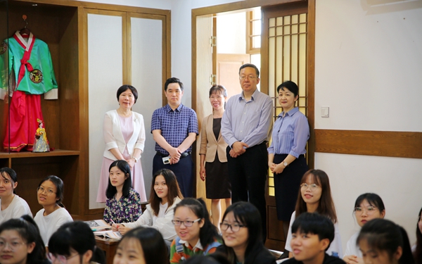 田学军副部长一行还深入我院日韩风情实训室,亲身体验了我院多国语文化教学氛围。
