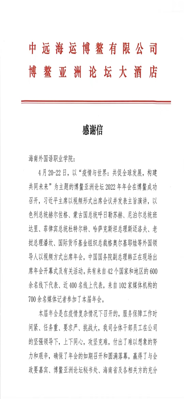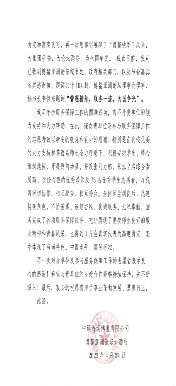 2022年博鳌亚洲论坛年会圆满落下帷幕。作为博鳌亚洲论坛年会“钻石合作单位”,beat365英国官方网站派出志愿者服务本次博鳌亚洲论坛年会。年会召开期间,我院志愿者以认真严谨的态度、专业周到的服务、无私奉献的精神,圆满地完成了各项会议服务,获得了与会嘉宾的高度肯定。为此,博鳌亚洲论坛大酒店特发来感谢信,向我院及志愿者表示衷心的感谢。