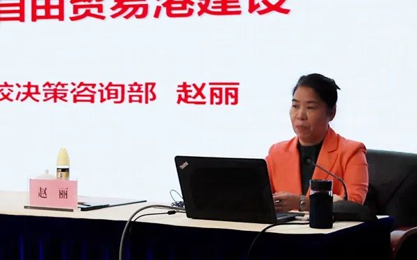 省委党校赵丽教授以《学习贯彻党的二十大精神,扎实推动海南自由贸易港建设》为题,带领全体学员学习党的二十大报告主要内容,结合全面贯彻落实“一本三基四梁八柱”战略框架作了生动诠释。