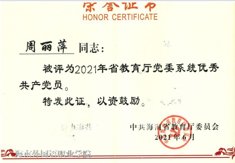 周丽萍老师荣获2021年省教育厅党委系统优秀共产党员