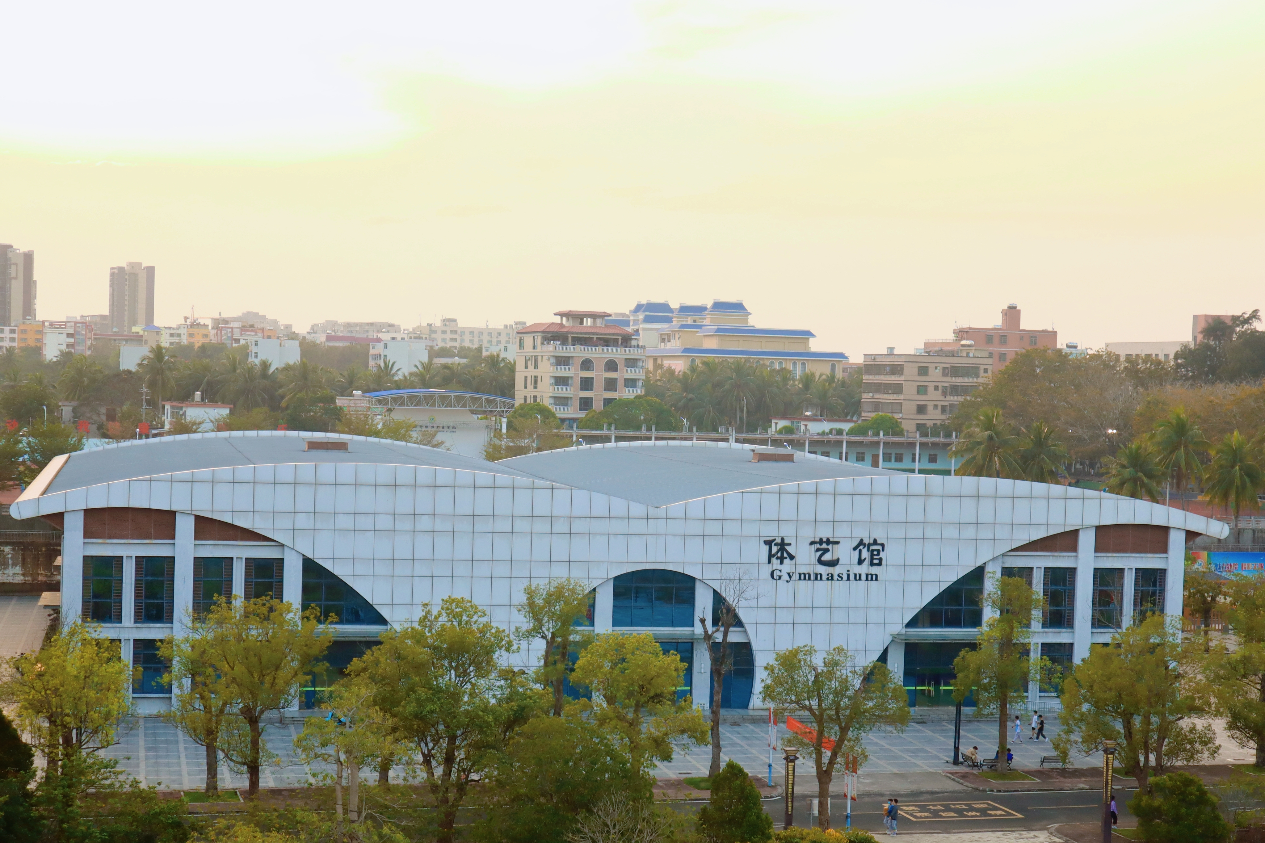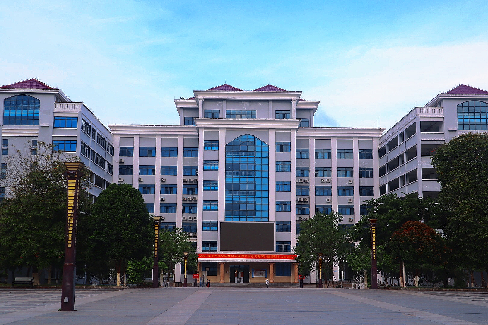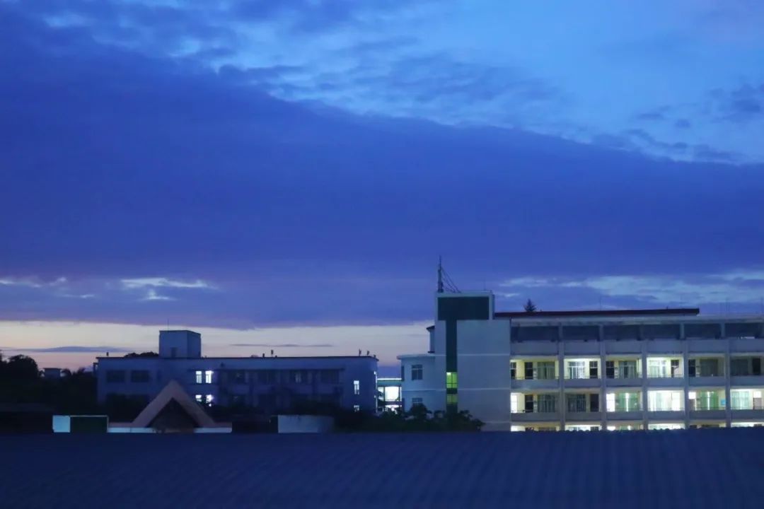 霞光斜照在教学楼上,洁净的玻璃倒映着晚霞的外衣,庄严的教学楼也显得些许温柔。