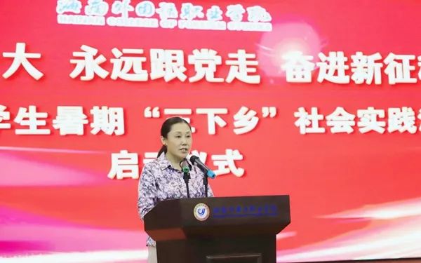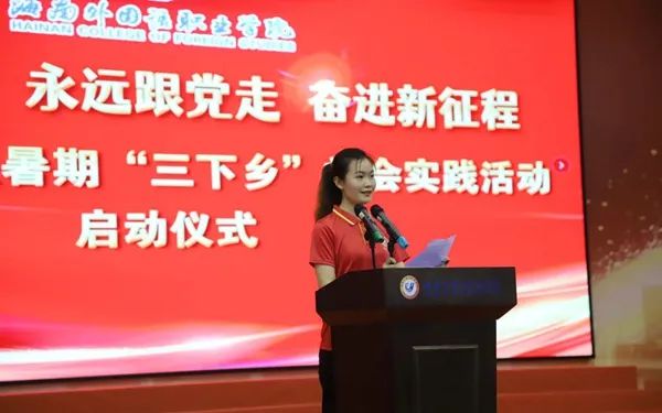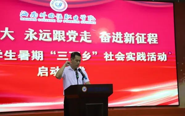 佴建乔代表学院党委向即将参加暑期社会实践的全体师生表示亲切的问候和良好的祝愿。她指出,大学生社会实践是加强和改进大学生思想政治教育工作、帮助和促进大学生成长成才的一个重要途径。在全省上下深入学习贯彻省第八次党代会精神之际,我院青年大学生应发挥思想优势、组织优势、知识优势和青春优势,以实际行动践行“高举团旗跟党走,建功海南自贸港”的坚定决心。